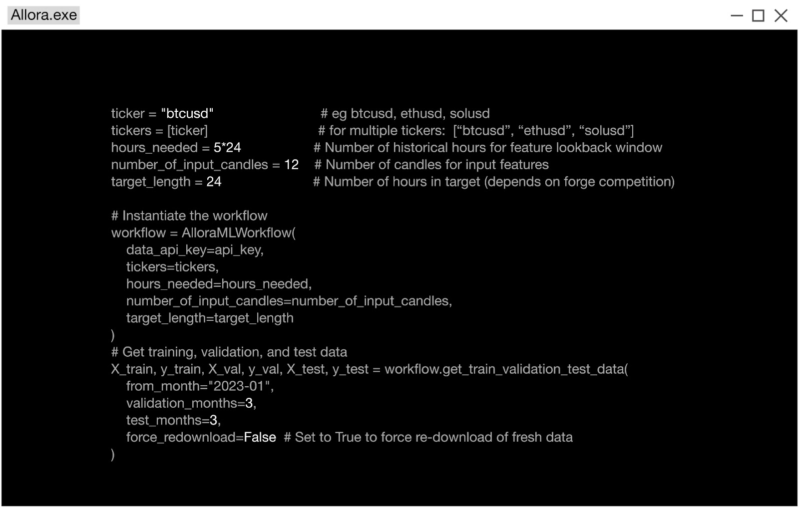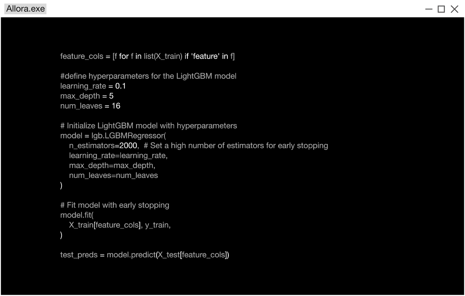 The Allora Forge Builder Kit solves this. By abstracting away the operational complexity of ML and blockchain, it lets machine learning engineers focus on what matters: building and refining models. Now, in a single notebook, engineers can go from dataset to live predictions delivered to the Allora Network in a matter of minutes.