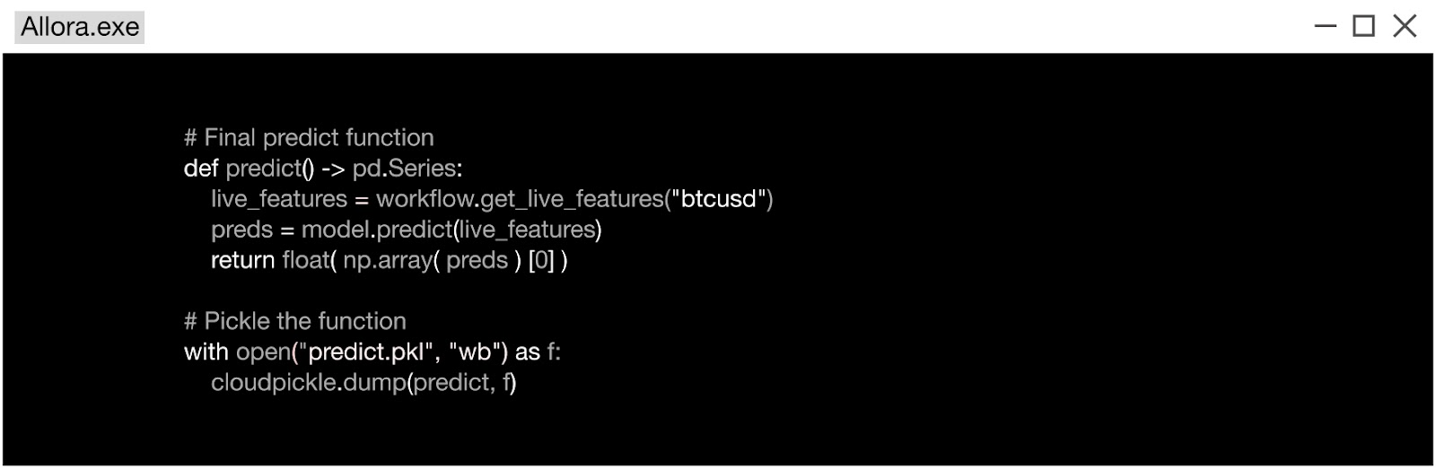 Launch a worker node using the packaged model. The worker then receives features from Allora in real time, applies the predict function, and begins streaming inferences back to the network.